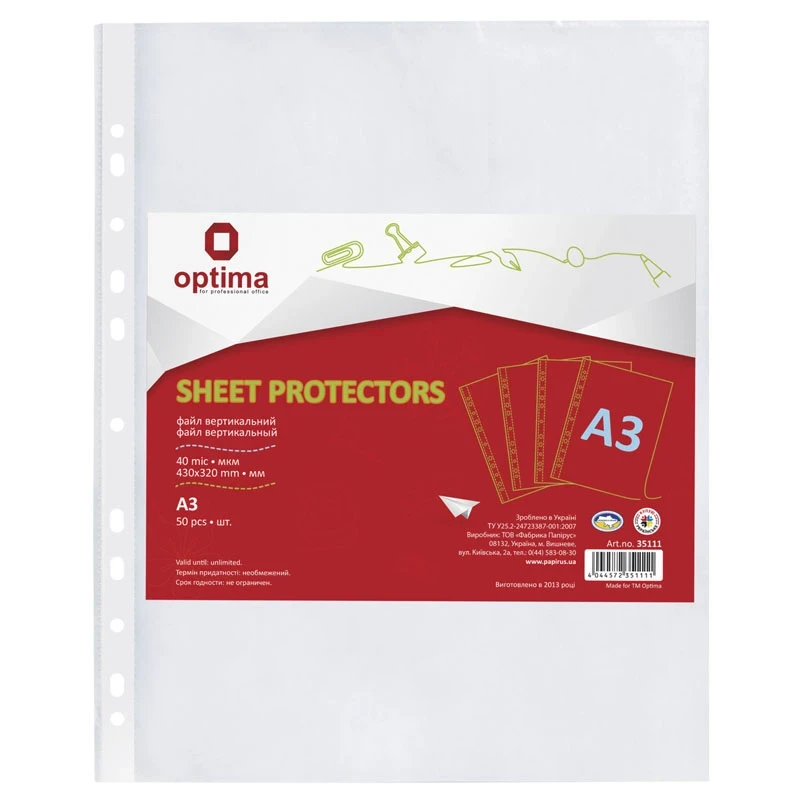 Файли для документів А3 Optima, 40 мкм, вертикальний, фактура "глянець" (50шт/уп) О35111