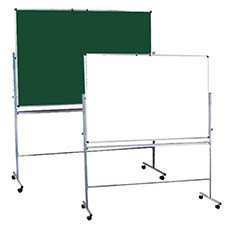 Двостороння шкільна дошка на колесах дозволяє збільшити робочу поверхню вдвічі в порівнянні з традиційною дошкою, яка монтується на стіну. Дошка легко повертається до 360 градусів. Надійний фіксатор нахилу. Обидві робочі поверхні дошки є сталевим листом, покритим спеціальною матовою зеленою/білою емалью. Завдяки цьому по дошці можна писати крейдою зодного боку та маркером з іншого та кріпити магніти.